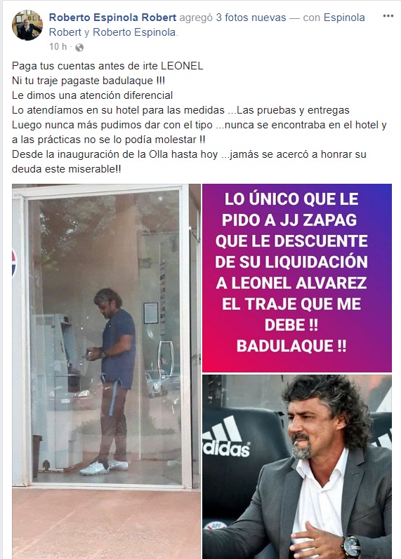 «Paga tus cuentas antes de irte Leonel”, dice una parte del posteo de Roberto Espínola, propietario de sastrerías Robert.