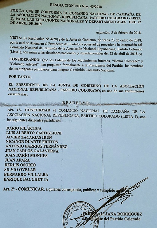El documento señala que el grupo está conformado por los representantes de los dos movimientos más importantes del Partido Colorado, ellos son Colorado Añetete y Honor Colorado.