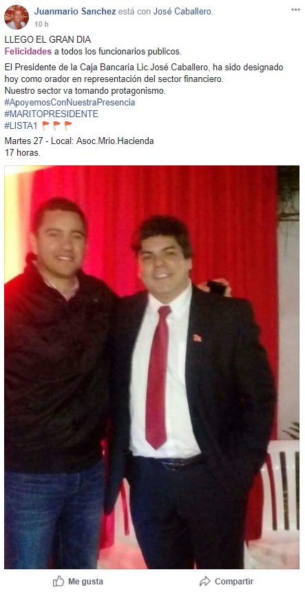 Caballero es presidente de la Caja Bancaria y se encuentra imputado por lesión de confianza. Aparentemente, esta situación hizo que el ejecutivo sea reemplazado por un funcionario del Banco Nacional del Fomento en la velada.