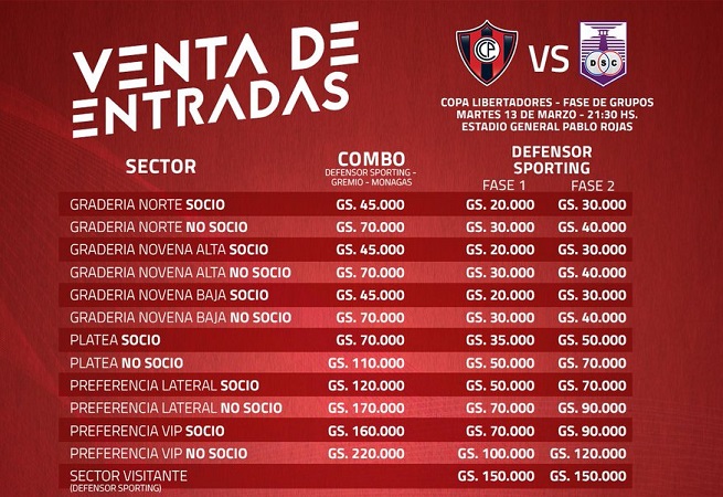 El informe del club indica que desde el jueves 1 al martes 6 de marzo la venta será exclusiva para socios y a partir del 7 de marzo en adelante serán libres para todo público, con precios de fase 1 hasta el domingo 11 de marzo. En tanto que el lunes 12 y 13 del presente regirán los precios de la fase 2 del certamen internacional.