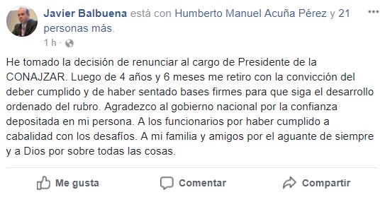 “He tomado la decisión de renunciar al cargo de Presidente de la CONAJZAR. Luego de 4 años y 6 meses me retiro con la convicción del deber cumplido y de haber sentado bases firmes para que siga el desarrollo ordenado del rubro. Agradezco al gobierno nacional por la confianza depositada en mi persona. A los funcionarios por haber cumplido a cabalidad con los desafíos. A mi familia y amigos por el aguante de siempre y a Dios por sobre todas las cosas”, fue lo que escribió en la mañana de este miércoles en su cuenta de Twitter.