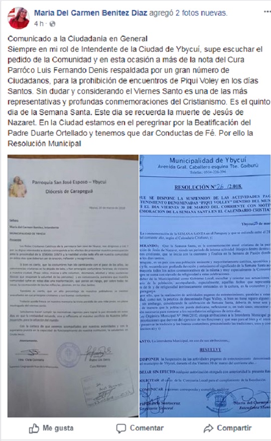 Intendenta de Ybycuí, Dpto. de Paraguarí, dispone la SUSPENSIÓN de las actividades «paganas» y cita textualmente el «piqui volley», con motivo de la Semana Santa. pic.twitter.com/TFQob95BFB