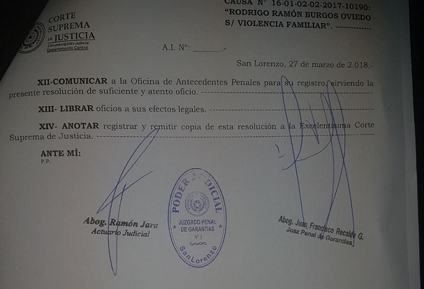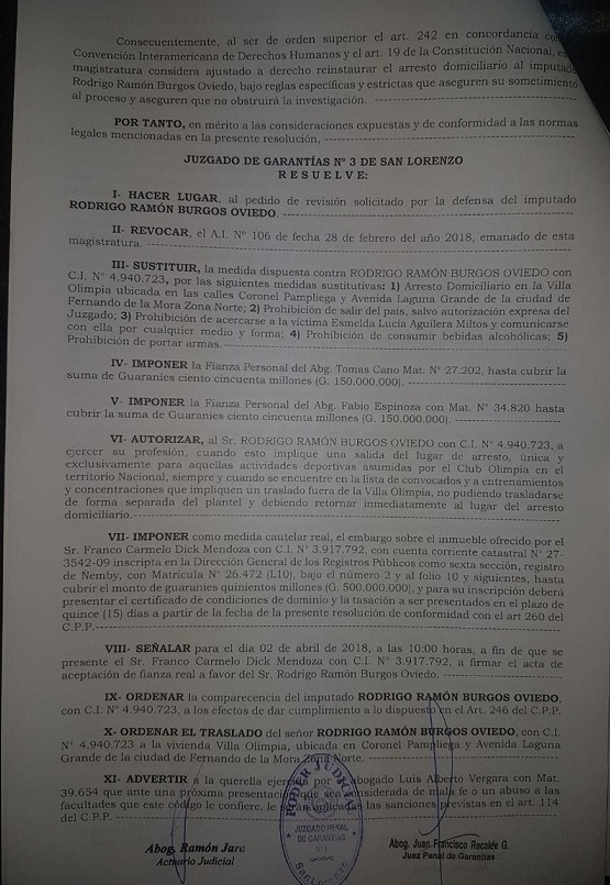 Burgos guardará prisión preventiva en la Villa Olimpia, en Fernando de la Mora. Además, tiene prohibido salir del país, prohibido acercarse a su expareja, Lucía Aguilera, prohibido portar armas y prohibido consumir bebidas alcohólicas.