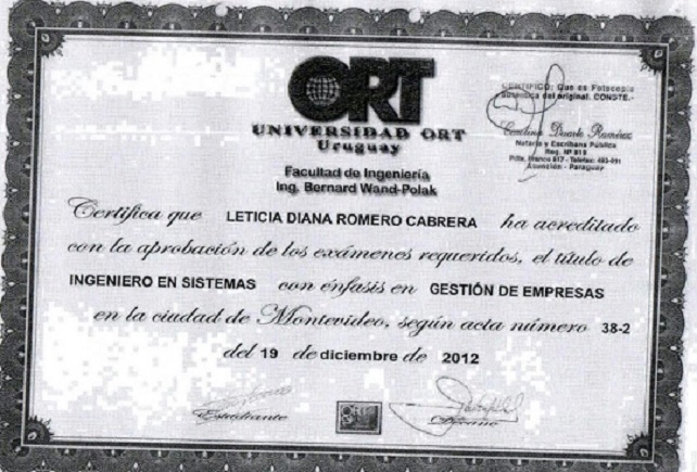 Leticia Romero presentó un título falso de la Universidad ORT de Uruguay y la dirección de Integridad de la Senatics efectuó la consulta correspondiente a la institución y la respuesta fue que el diploma “es totalmente falso” y que no coinciden ni el formato, ni el diseño gráfico ni las tipografías utilizadas.
