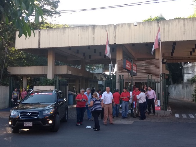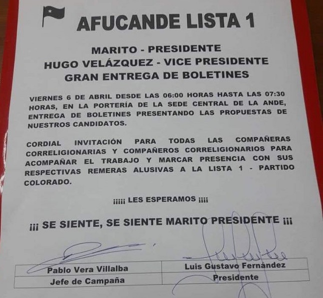 La invitación para lo que se puede llamar un improvisado mitin se realizó desde varios días antes. Una agrupación de funcionarios de la estatal fue la encargada de pegar calcomanías de la lista de Mario Abdo Benítez y repartir trípticos.
