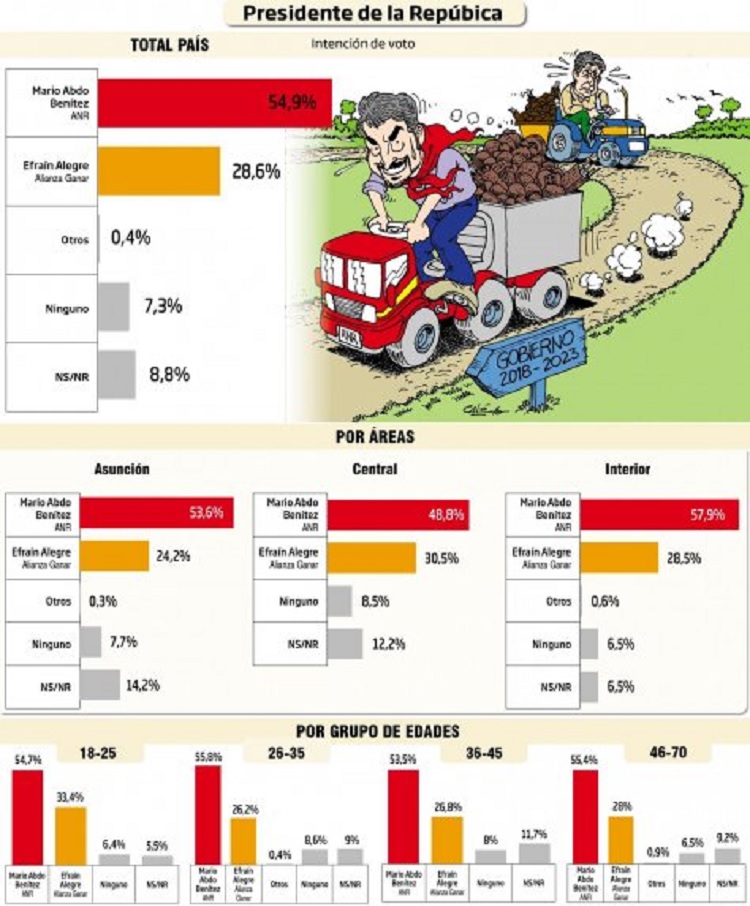 Por último, los datos muestran un fuerte respaldo de los jóvenes hacia Mario Abdo Benítez. Mientras que los votos por áreas revelan que Alegre tiene poco apoyo en Asunción.