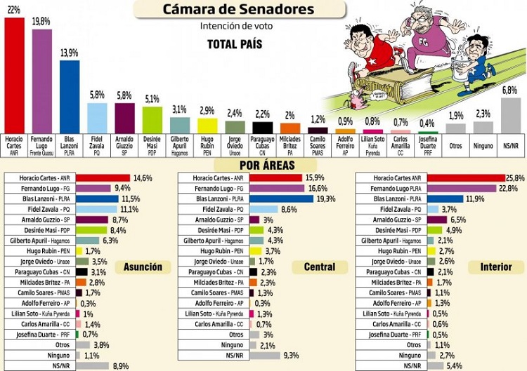 No obstante, el presidente Horacio Cartes lidera la intencionalidad de votos, pero solo por dos puntos sobre la nómina encabezada por el exobispo Fernando Lugo. Este último tiene su fuerza electoral en el interior del país.
