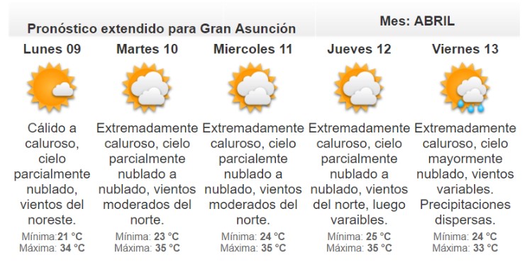 El meteorólogo de turno, Julio Ayala, afirma el ambiente continuará cálido por la mañana y caluroso por la tarde, con alguna posibilidad de lluvia recién para el viernes.