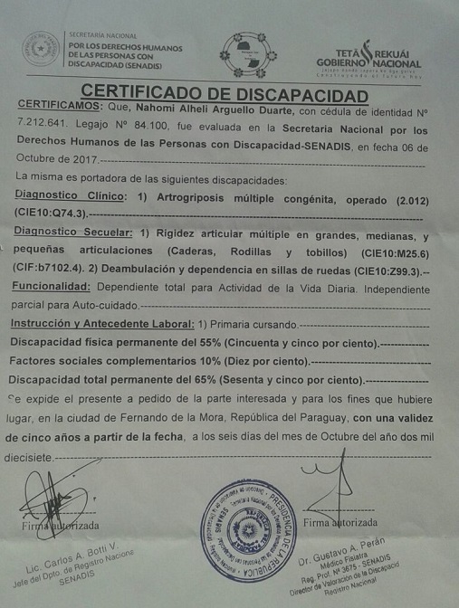 Liz Duarte, madre de Naomi, explicó a RDN que su pequeña padece de artrogriposis desde el nacimiento y que atravesó por cuatro operaciones.
