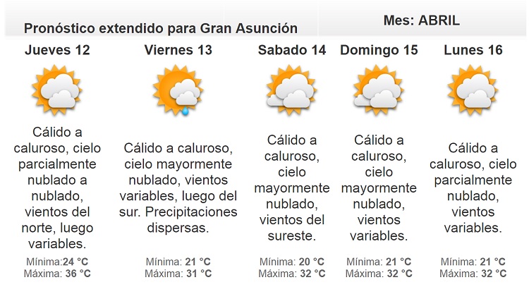 Por otra parte, anuncian la proximidad de un frente frío al país, con lo que la probabilidad de lluvia aumentará levemente sobre el sur y centro de la región Oriental y el oeste chaqueño.