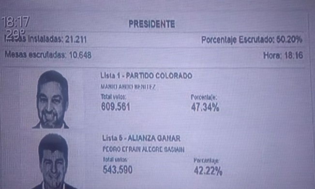 Con poco más del 50% de los votos escrutados, la dupla conformada por Mario Abdo Benítez y Hugo Velázquez marca una importancia diferencia, ya que logró alcanzar el 47,37%, con 609.561 votos.