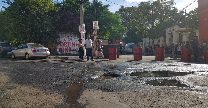 La misma situación de desidia presenta las inmediaciones; asfaltado con baches y agua del desagüe del alcantarillado por las calles.