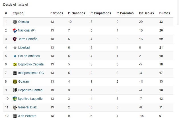 Olimpia disfruta de la cima del campeonato y el Legendario se encuentra relegado, con solo 13 unidades, en la tabla de posiciones.