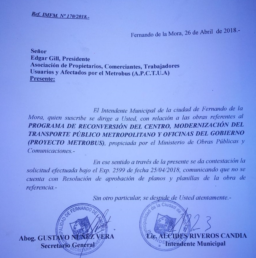 Es así que el intendente Alcides Riveros, de Fernando de la Mora, respondió una nota al presidente de la asociación de comerciantes Edgar Gill, donde indicó que no cuentan con resolución de aprobación de planos y planillas del proyecto del metrobús en la citada ciudad.
