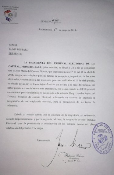 En relación al tema la jueza Patricia Blasco, emitió una nota al presidente del TSJE, Jaime Bestard, por la ausencia injustificada de la magistrada María del Carmen Nováis, según reportó Abc color.