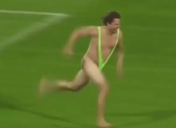 Un hincha del Viktoria Pilsen, de República Checa, uno de los equipos más grandes del país, ingresó al campo de fuego semidesnudo y vestido del personaje de ficción Borat.