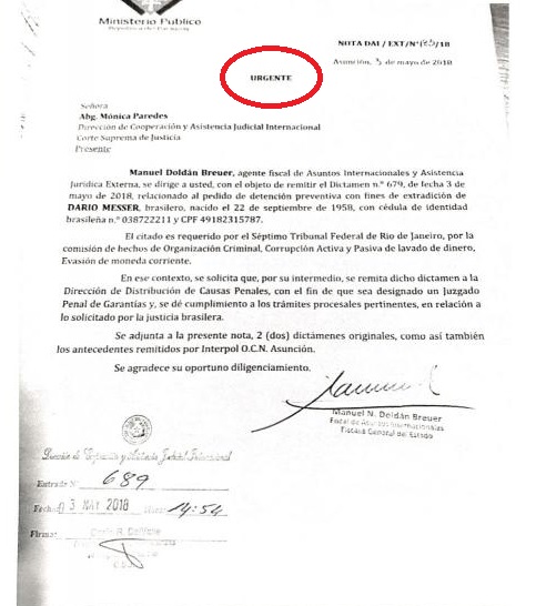 El pasado jueves la Fiscalía impartió la orden de detención contra el empresario brasileño Darío Messer, quien está vinculado en el caso de corrupción “Lava Jato” en el Brasil.
