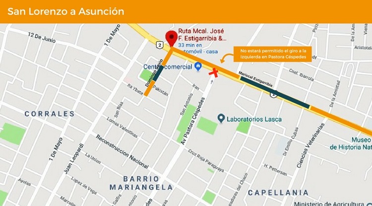 No obstante, aquellos que circulan por la Ruta 2 Mcal. Estigarribia y acostumbran girar a la izquierda en la Avda. Pastora Céspedes, tendrán que avanzar hasta la calle Domingo Savio para ingresar al lado sur de la ciudad de San Lorenzo.