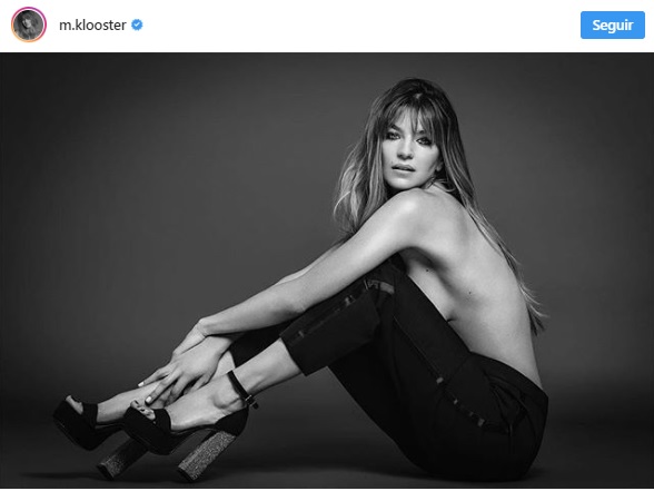 En la fotografía se la ve sentada, con su torso descubierto, pero discretamente cubierto por su pierna, y luciendo los zapatos que son de su negocio.