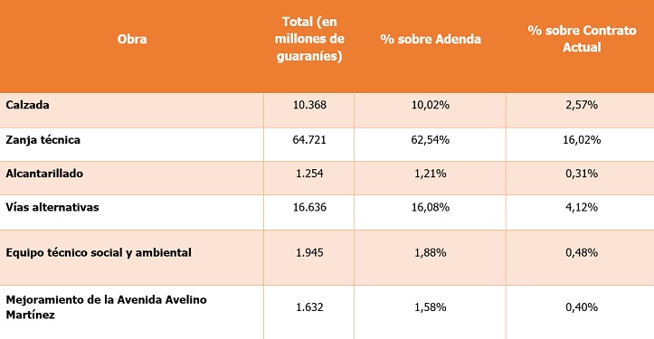 Por ejemplo uno de los puntos es la construcción de la zanja técnica no figuraba en el proyecto inicial, y su incorporación constituye el principal motivo del incremento del contrato suscrito con la empresa Mota-Engil, encargada de la construcción de los Tramos 2 y 3 (desde el Campus de la Universidad Nacional de Asunción, en San Lorenzo, hasta el Mercado 4).