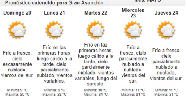 Para hoy se aguarda extremas entre los 15°C a 21°C en horas de la tarde, mientras que las mínimas oscilarían entre los 8°C y 12°C, y las máximas entre los 17°C y 24°C hasta el martes en ambas regiones del país.