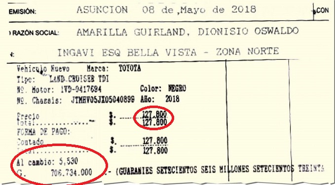 El diario ABC Color reveló que el legislador liberal adquirió una camioneta, Toyota tipo Land Cruiser, por valor de USD 127.800, es decir unos G. 706 millones al cambio de ese momento, según consta en los documentos.