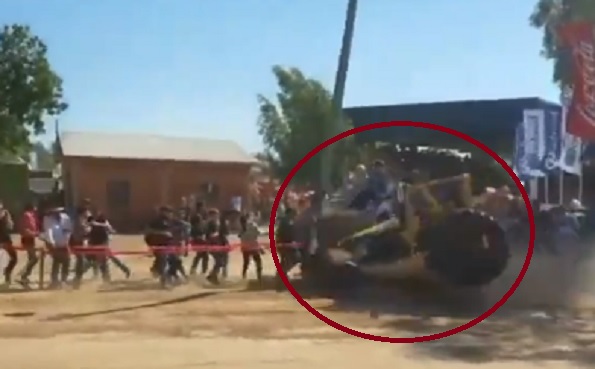 Varios videos que se viralizaron en redes sociales muestran la improvisada carrera y la violencia del choque del tractor contra lo que parece ser una columna, lugar en el que se encontraba una gran cantidad de público.