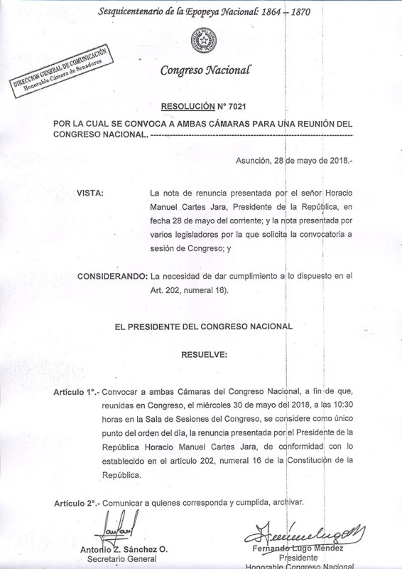 De acuerdo a lo informado por el portal de la Cámara de Senadores, el presidente de la Cámara Alta, Fernando Lugo Méndez, mediante la Resolución N° 7021, convocó a ambas Cámaras para una reunión del Congreso Nacional para el miércoles 30 de mayo del 2018, a las 10:30 horas en la Sala de Sesiones del Congreso.