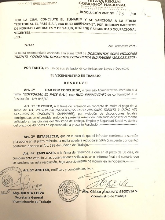 Esta es una prueba concreta de que nuestras denuncias y reivindicaciones tienen causas reales: las empresas periodísticas violan leyes laborales en detrimento de sus trabajadores y trabajadoras. Tras meses de haber solicitado una fiscalización a Editorial el País, comunicamos que la empresa fue sancionada con una multa de más de 200 millones de guaraníes. Además de aceptar y pagar la sanción, la empresa se comprometió a adecuarse a todas las normas laborales, en tanto que el Ministerio del Trabajo realizará seguimiento para asegurarse del cumplimiento de las leyes.