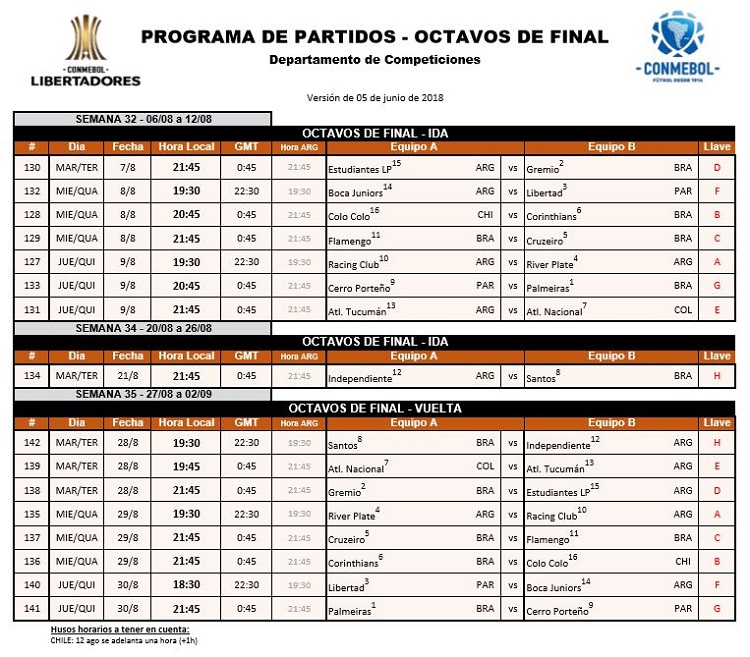 Este martes se conocieron las fechas y los horarios de los partidos de ida y vuelta de los octavos de final para definir la siguiente etapa de la Copa Libertadores.
