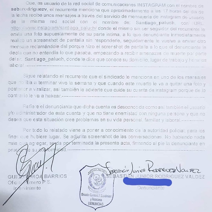 Según la denuncia policial, el periodista de farándula, Sebastián Rodríguez, manifestó que no conoce al hombre que lo amenazó de muerte, incluso cuando le envió el primer mensaje.
