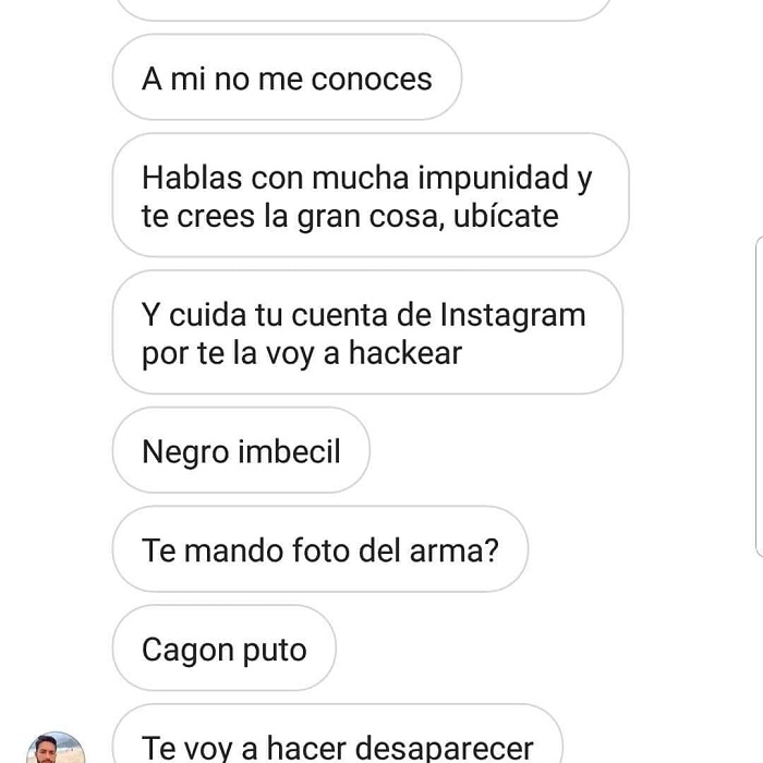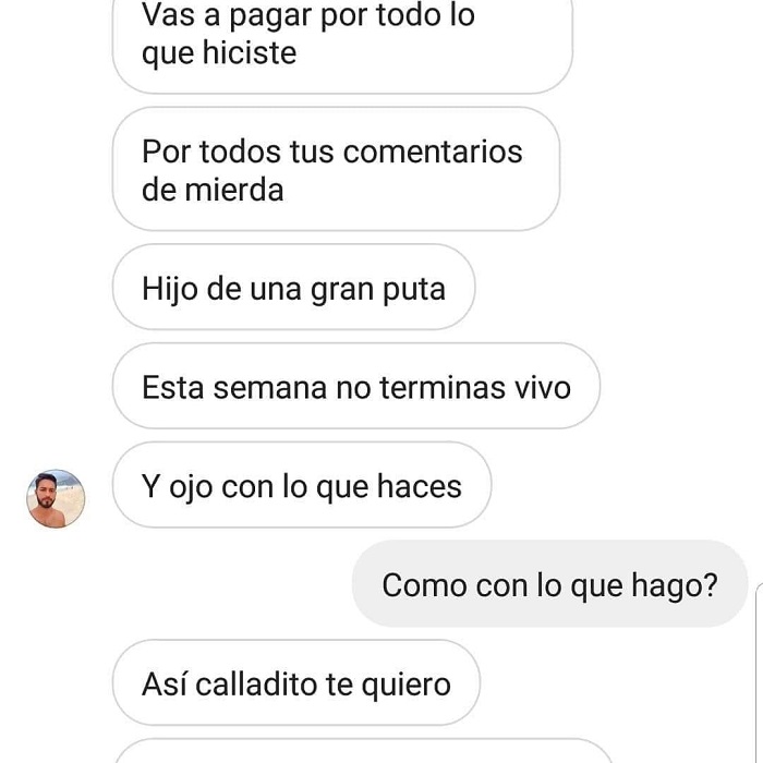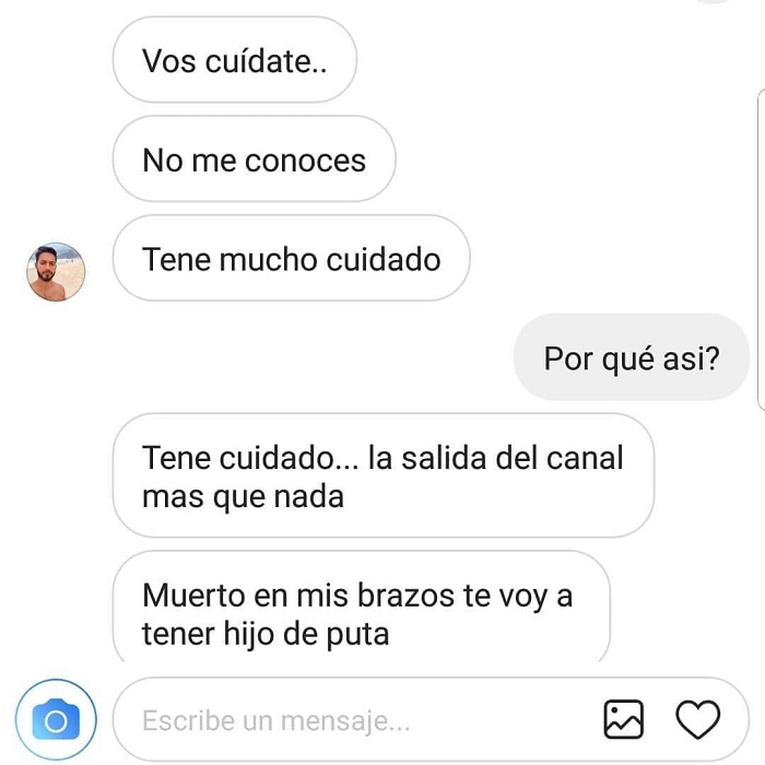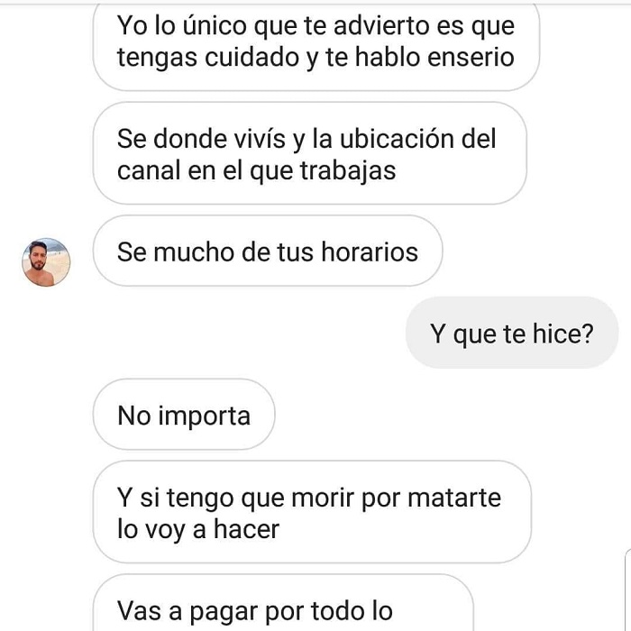 Molesto por el hecho, el hombre lo amenazó de muerte, incluso afirmó conocer todos sus movimientos. “Muerto en mis brazos te voy a tener”, se lee en uno de los mensajes.