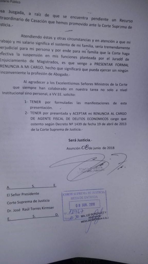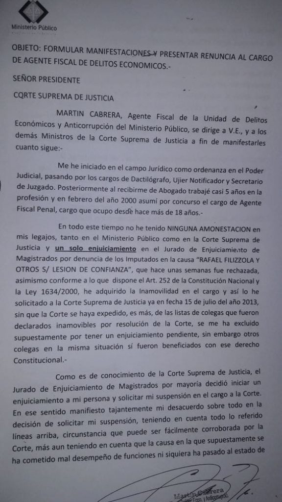 Nota de renuncia al cargo de Agente Fiscal de Delitos Económicos y Anticorrupción del Ministerio Público firmada por el Dr. Martin Cabrera quién en más de 18 años en la institución pasó por varios departamentos. #1020AM pic.twitter.com/P5agQGGSdq