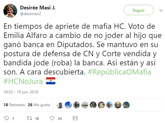 “En tiempos de apriete de mafia HC. Voto de Emilia Alfaro a cambio de no joder al hijo que ganó banca en Diputados. Se mantuvo en su postura de defensa de CN y Corte vendida y bandida jode (roba) la banca. Así están y así son. A cara descubierta”, publicó la senadora a través de su cuenta de Twitter.