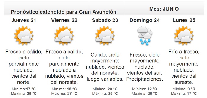 Así mismo, para los próximos continuarán los amaneceres frescos y las tardes cálidas e incluso calurosas en algunos puntos del Chaco, con un aumento de la nubosidad para el viernes.