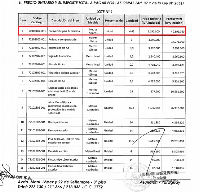 En el ítem de excavación para fundación, por solo 4,45 metros cúbicos se acordó pagar casi G. 41 millones (ver detalle abajo).