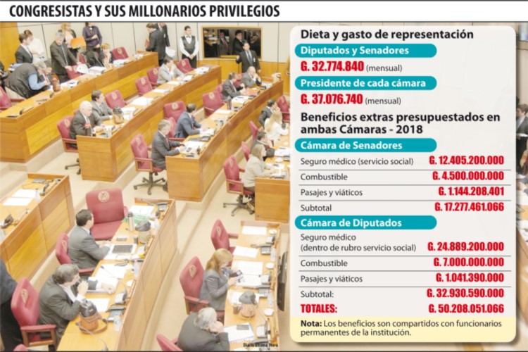Más de G. 50.000 millones son destinados anualmente, no solo a su dieta que superan los G. 32 millones y a los gastos de representación, también a seguros médicos vips, los cupos de combustible y los pasajes y viáticos.