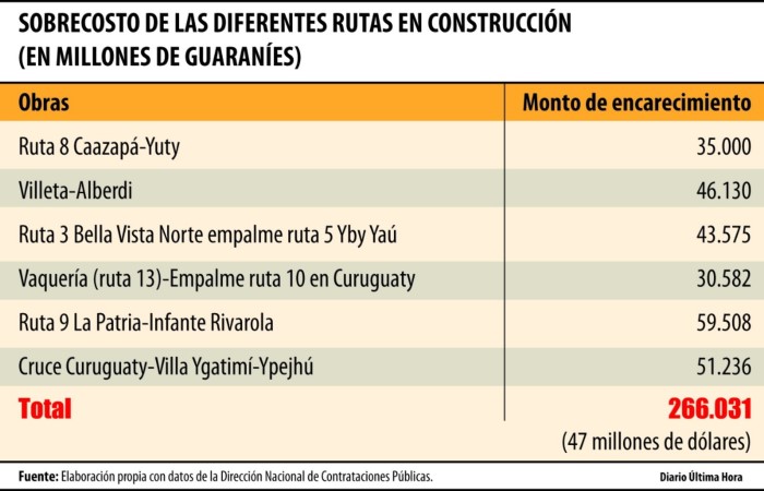 La mayoría de las obras iniciaron hace cuatro años, pero hasta la fecha concluyeron. Cabe destacar que todos estos proyectos registraron un sideral sobrecosto que ya llegó a los USD 47 millones, de acuerdo a los documentos oficiales revisados por dicho medio.