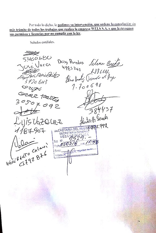 En la misma se solicita la suspensión de actividades y cancelación inmediata de licencia de la empresa Wels S.A, planta de tratamiento de residuos hospitalarios que se encuentra ubicada y opera en el Complejo Barrail de la Costanera de Asunción.