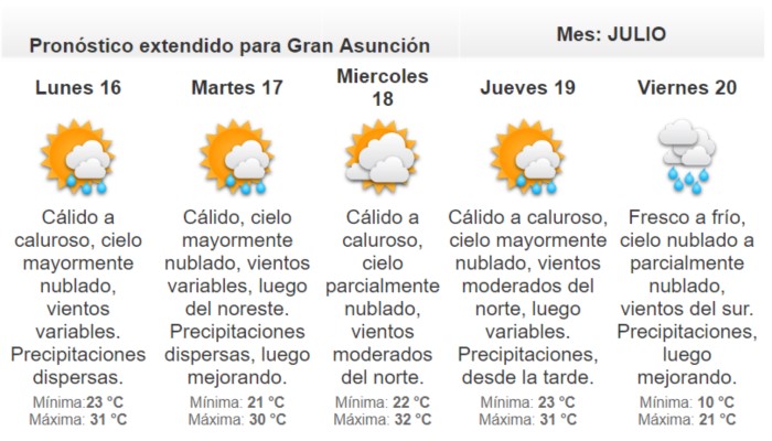 Así mismo, desde la Dirección Nacional de Meteorología, sostienen que para este domingo habrá vientos moderados del norte y al finalizar la semana ingresará un frente frío sobre el país, generando lluvias y un descenso marcado de la temperatura.