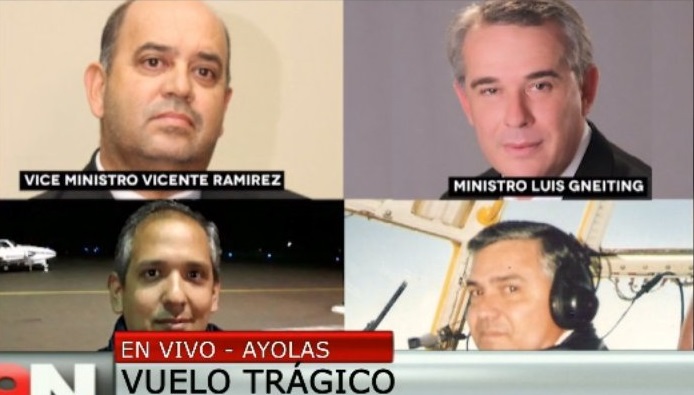 La avioneta en la que se trasladaban el ministro Gneiting, el viceministro Ramírez, el piloto Gerardo López, el copiloto Luis Charotti, cayó en un esteral, minutos después del despegue, este miércoles a las 18:30 aproximadamente.