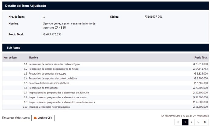 Los informes indican que la adjudicación en 2014 se llevó a cabo para “el mantenimiento y reparación de las aeronaves del MAG». Dicha negociación fue por la suma de G. 400 millones.