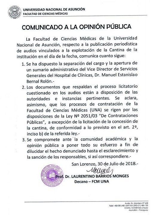 La Facultad de Ciencias Médicas de la Universidad Nacional de Asunción (UNA), separo de su cargo al vicedirector tras hallar evidencias sobre hechos de corrupción. .