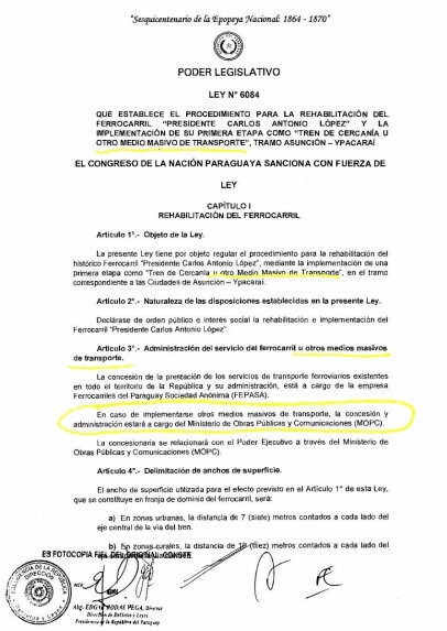 Es un plan de Ferrocarriles del Paraguay (Fepasa), aprobado en la Cámara de Senadores en noviembre de 2017.Posteriormente pasó para su estudio en la Cámara Baja.