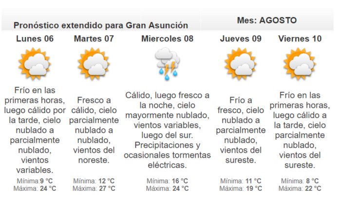 Así mismo, para el norte y noreste del Chaco y de la Región Oriental, podrán registrarse algunas lluvias y tormentas eléctricas aisladas, mientras que en el resto del país serían solo algunas lluvias débiles y dispersas
