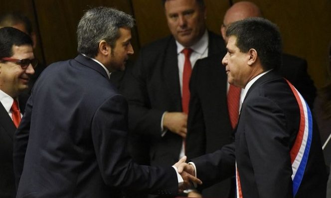 El presidente electo Mario Abdo Benítez extrechando la mano del presidnete saliente, Horacio Cartes. Foto: ABC Color.