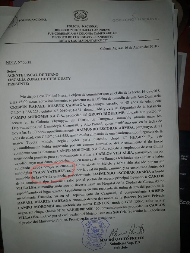 Dijo que un hombre identificado como Crispín Duarte se acercó hasta la mencionada sede policial a señalar que un conductor, Raimundo Escobar Armoa, ingresó al predio conocido como Campos Morombí a sacar del lugar a Carlos Villalba.