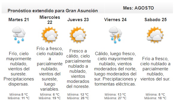 Según el reporte de la meteoróloga Cinthia Espínola la jornada se presentará la sensación térmica será baja debido a la persistencia de los vientos, y la probabilidad de lluvias intermitentes será elevada.