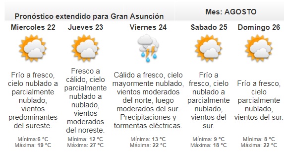 Según el reporte de la meteoróloga, Violeta González, la sensación térmica será baja debido a la persistencia de los vientos. La probabilidad de lluvias será elevada y se registrarían de manera intermitente en gran parte del territorio nacional.
