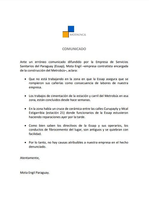 Tanto la Empresa de Servicios Sanitarios del Paraguay (Essap) y la empresa contratista del Ministerio de Obras Públicas y Comunicaciones (MOPC), a través de comunicados oficiales, se responsabilizaron entre sí por el incidente del caño roto en la zona de obras del Metrobús.